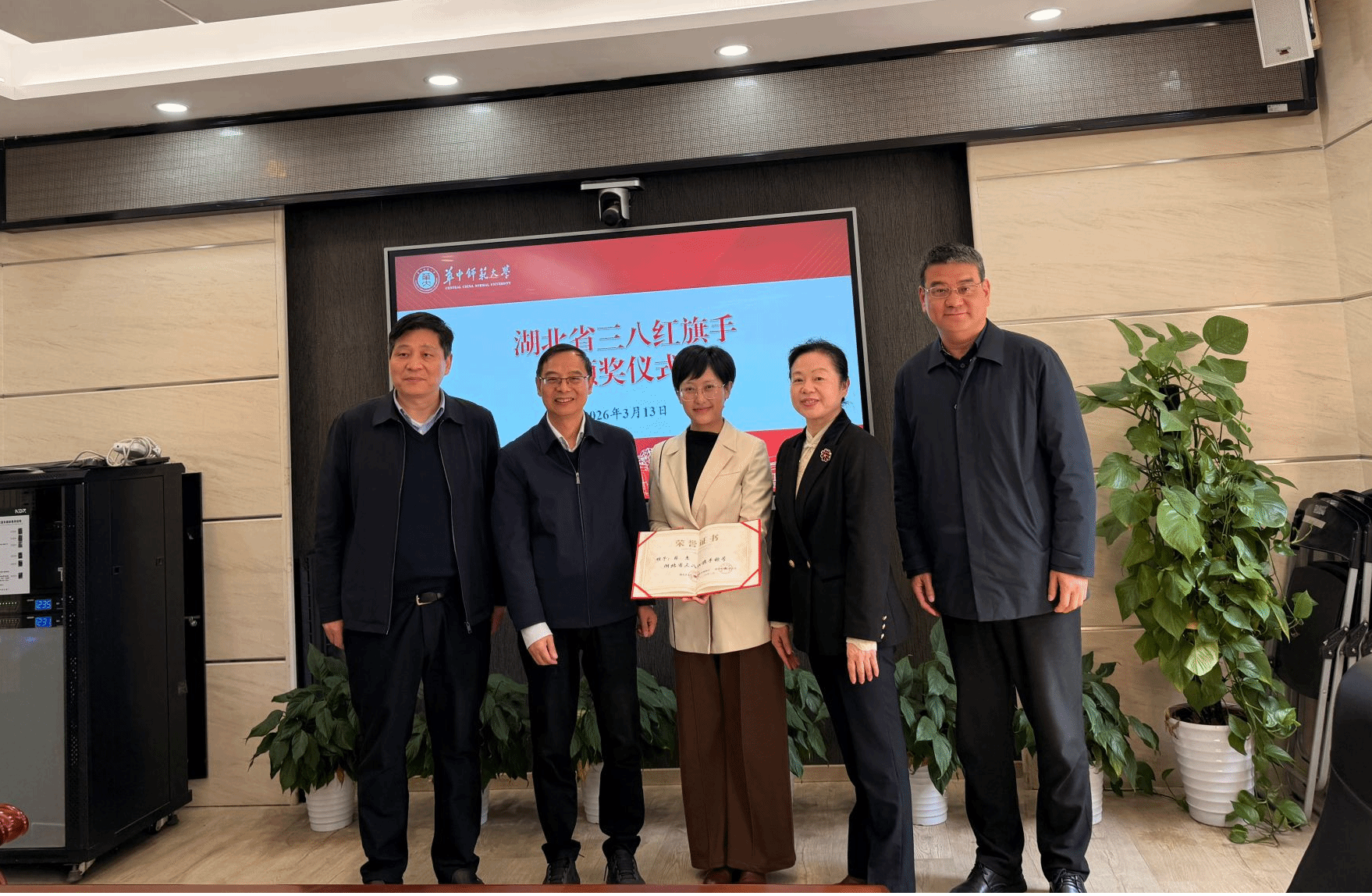 (通讯员 左焦杰 孙颖奇)3月13日上午,湖北省“三八红旗手”颁奖仪式在学校行政楼316会议室举行。湖北省妇联党组成员、副主席彭艳红一行莅临我校,为马克思主义学院薛惠教授颁发“湖北省三八红旗手”证书。颁奖仪式由校工会主席骆军主持,校党委副书记查道林出席活动并讲话。