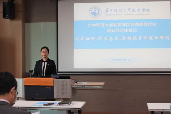 2022年11月11日,教育学院第四届教代会第五次全体会议在田家炳楼905教室举行。此次教代会以“百年征程,踔厉奋发,再创教育学院新辉煌”为主题,学院党政领导、全体教职工参加了会议。会议由学院党委副书记苏春艳主持。