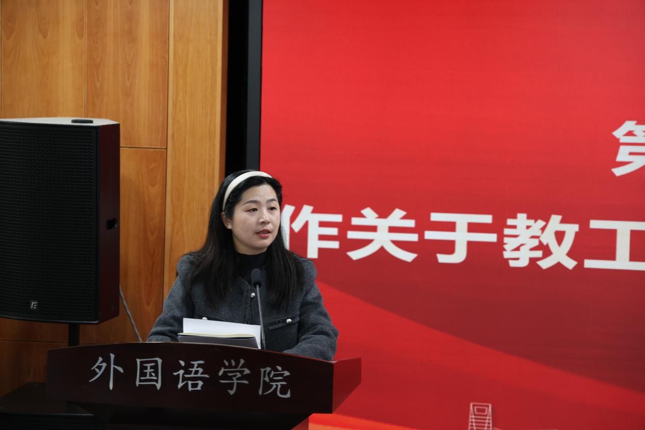 院工会主席何卫华以“凝心聚力促发展,扬帆启航新征程”为题,从具体工作入手,总结了2024年度外国语学院工会工作的亮点:一是创新引领、凝心聚力,院工会采取一系列创新举措,加强学院民主管理和制度建设。二是佳绩频传、收获满满,学院不仅在各类文体活动中表现突出,而且获得多项重要荣誉和表彰。三是齐心协力、共创未来,期待广大教职工更加积极和深入地参与到工会工作中来,共同为学院未来发展建言献策。
