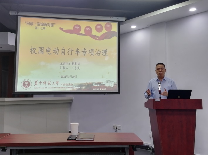 (通讯员 王焱)5月19日下午,校工会在工会一楼报告厅举办了第十七期“问政•咨询面对面”活动。本期活动的主题是:校园电动自行车专项治理。本次活动由校工会常务副主席郭春娥主持、保卫处处长王东爽主讲,各学院代表参加本期活动。