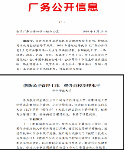 (通讯员:巴熙杨)2026年1月29日,全国厂务公开协调小组办公室在今年第1期《厂务公开信息》中以《创新民主管理工作 提升高校治理水平》为题,介绍了我校在民主管理规范化建设方面的做法和典型经验。此次刊发的我校民主管理经验在全国总工会办公厅开展的企事业单位民主管理典型经验培育工作中,被确定为2025年全国企事业单位民主管理规范化提升试点项目,在全国高校进行推广。