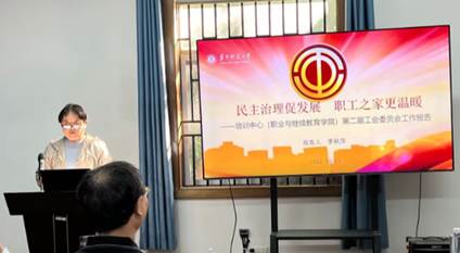 李秋萍主席以《民主治理促发展 职工之家更温暖》为题,代表中心第二届工会委员向大会作了工作报告。五年来,在校工会的直接指导下,在中心党委的正确领导下,第二届工会以党的十九大和十九届历次全会精神为指导,紧紧围绕中心发展大局,认真履行维护、建设、参与、教育四大职能,勤恳务实开展各项工作。一是学习贯彻习近平总书记关于工会工作的重要指示精神,不断加强工会自身建设,提升委员参与民主治理的政治素养和服务教职工的业务能力;二是紧紧围绕中心事业发展这一主线,认真履职尽责,主动作为,充分发挥“桥梁”“纽带”作用,推动民主治理,促进中心事业高质量发展;三是积极维护教职工合法权益,努力丰富教职工思想文化生活,聚焦民生,解难济困,全心全意为教职工服务,营造温暖的“职工之家”。最后,李主席还充满感情色彩地分享了五年来的工会工作感受,整个报告感性与理性交融,引起了与会会员的广泛共鸣,赢得了阵阵掌声。