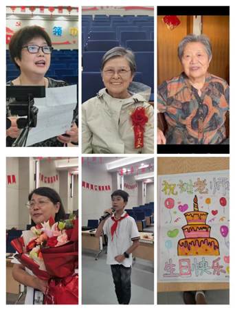 接着,老协会长袁老师代表全体退休教师感谢学校领导的关怀与关心。祝刘老师及全体退休教师天天开心,健康长寿;随后蔡根娣、徐荣娣、李秀英、吴爱莲、韩菁、杨正昭代表老教师发言,他们回忆了当年与刘老师一起工作的情景,讲述了许多动人的故事;杨冬菊副校长给刘老师鲜花;五(3)班学生王子怡为刘老师高歌一曲《金色的太阳》;六(2)班学生柳烨表演了诗朗诵《寻梦》;四(2)班几位学生在德育部门指导下还亲手制作了生日贺卡,表达对刘老师的敬仰之情。柳景元老师因腿脚不便,不能亲临现场,特意发来短视频,祝好朋友刘老师生日快乐;远在加拿大的杨筱芳老师写了网上贺岁诗,由袁老师代为朗诵......这些场景,将会议推向了高潮!
