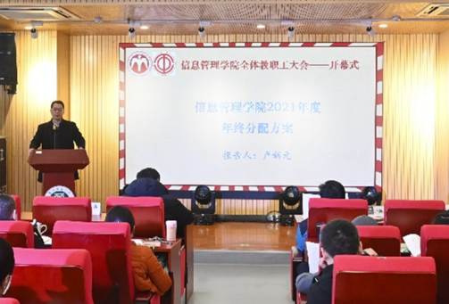 [通讯员:张珺]2022年1月7日,信息管理学院召开了学院的二届三次教代会,参加会议的人员为信息管理学院领导班子及全体教职工。会议得到学院党委和领导班子的高度重视和组织,会议的议程包括,工会工作报告、学院工作报告、年终绩效分配和十四五发展规划的讨论和审议。