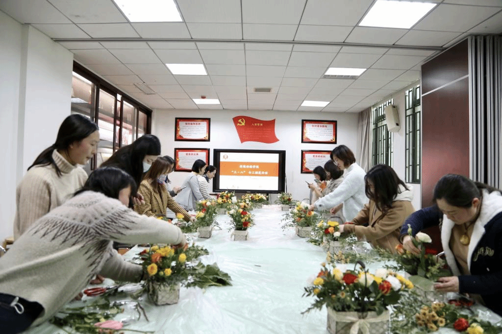 (通讯员汪芸 钟蕊 覃星媛)2021年3月9日下午,由我院工会会组织,女教职工参与的“三·八”女工花艺活动圆满结束。为了能够让我院教职工在花艺活动中体验到更多乐趣,工会除了为每位参与活动的老师提供新鲜花朵和花艺工具外,还特意邀请了专业的花艺老师教大家插花技巧。活动期间,花艺师细致地为教职工们讲述花艺的理论知识,示范插花技巧,在大家动手实操的过程中,花艺师也在一旁耐心地指导。