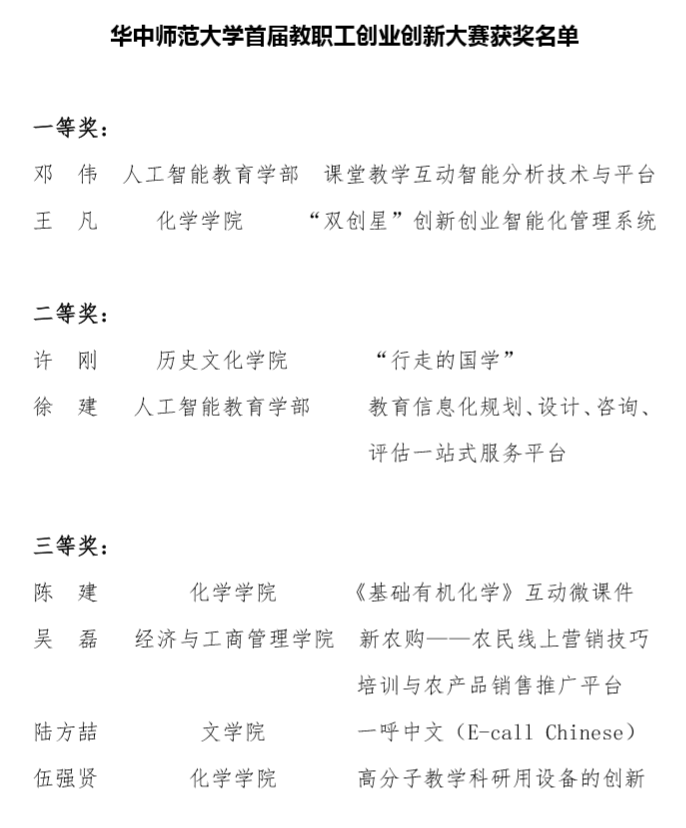 为深入学习贯彻习近平总书记关于统筹推进新冠肺炎疫情,防控和经济社会发展工作系列重要讲话精神,校工会于今年6月启动了华中师范大学首届教职工创业创新大赛,化学学院教职工响应学校号召,积极参与,王凡、陈建、伍强贤三位老师斩获佳绩。