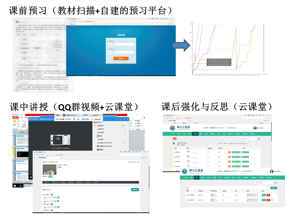 在自建的预习平台、华师云课堂和QQ群视频的支持下,闵老师实施了全过程管理的在线教学。课前,将预习视频和教材上传到自建的预习平台中,待学生预习之后可生成学生的观看轨迹,从中分析教学重难点;课中,根据从学生预习中诊断出的重难点进行详细讲解和活动组织;课后,学生回到华师云平台完成作业和撰写课堂反思,通过反思可及时了解学生学习过程中存在的问题和疑问。通过课前—课中—课后的全面管理,她的教学工作量没有因为在线教学而减轻,反而增加了许多,但是她认为疫情影响了生活,但不能影响教学质量。