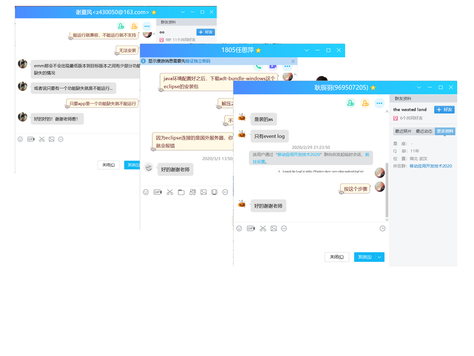实施在线教学还有很多其它的准备工作,比如闵老师在开课前一周就开始调研学生的身体状况和学习条件,是否有同学身体不适、家里是否有电脑开展后续的学习、是否能买到教材等等。令她欣喜的是,所有选课的同学都能如期网上报到,具备在线上课的条件,但是开课前还存在一个最大的困难就是同学们的教材无法买到,因为很多地区快递停运。为了保障教学效果,她决定在每次上课前一周,将相关的教学材料以拍照的方式发给学生,这样同学们既可提前预习,也可课后复习。同时,为了选择一个稳定的同步课堂系统,开课之前她就组织助教测试了多个直播平台,比如腾讯课堂、钉钉、QQ群视频、虎牙直播等等。闵老师深知技术在教学中的重要作用,用得好是锦上添花,用得不好则是画蛇添足。所以在比较了众多直播平台之后,闵老师最终选择了同学们最为熟悉的QQ群视频。