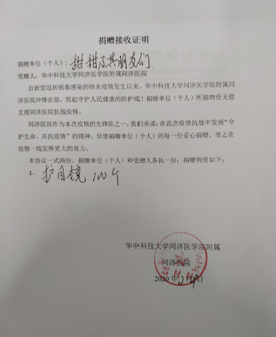 其次,作为一名湖北疫区人民,看到全省医护人员搏命付出,全国医护人员闪电驰援,全国各地乃至全世界人民的倾囊相助,内心除了感动,也有着深深的无力感,总想为无私奉献的白衣战士们做点什么,可是自己什么也做不了,每天只能在心里为他们祈祷。直到我所在的妈妈群里的一位妈妈联系到了生产医疗护目镜的厂家,我开始参与组织护目镜募捐,我的心态才逐渐好转。经过积极筹措,我们临时组建的医院募捐群一共募集资金62260元,为中南医院、武汉市中心医院、中西医结合医院、武汉市中心医院汉阳院区、协和医院、同济医院、省人民医院捐赠护目镜共计1110付,并拟为一线女性医务工作者捐赠护手霜1000支。终于,作为一名普通市民,我能为报薪者做点儿什么了。