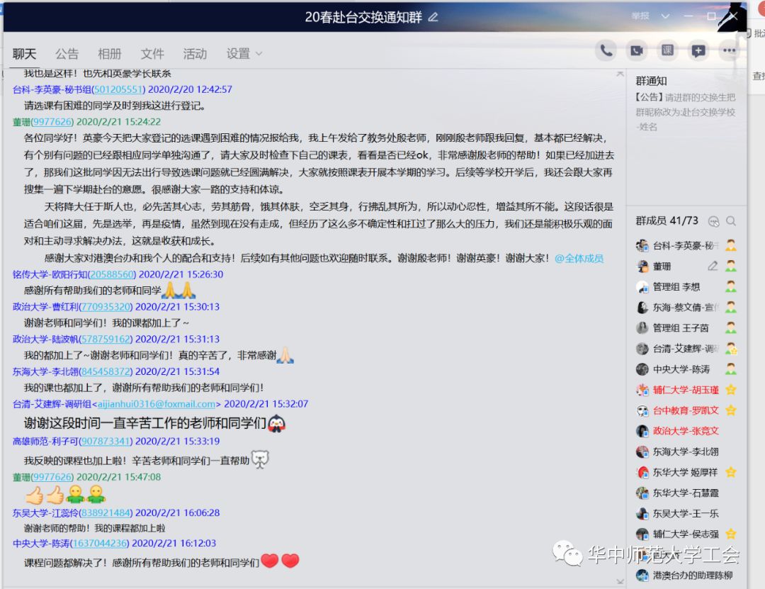 一路走来,董老师了解所有人的不容易,所以当真的要面对无法成行的可能时,这种焦虑和不甘心的情绪感同身受。在交换生交流群里的画风,之前都还是在讨论在哪里可以买到便宜机票和交换生保险,带什么伴手礼。可到1月下旬,大家的心就不由自主的提了起来,焦虑在蔓延,大家都在关注着新冠病毒疫情的发展,期盼着情况能尽快好转,可收到的消息却不容乐观。1月20日明确人传人,23日武汉封城,24日台当局禁止口罩出口,25日台当局禁止研修生赴台,还有同学的航班陆续被取消……学生们分享的消息一个接一个,都是令人担忧和焦虑的,本是轻松愉快的行程变得扑朔迷离,充满不确定性。董老师作为主管老师,一方面陪伴安抚学生,引导他们在非常时期保持定力,告诉他们不论发生什么情况,学校都会有妥善的安排;另一方面,跟台湾姊妹校保持密切的联系,搜集各个学校的最新资讯,有的台湾姊妹校表示需要取消交换,有的表示需要延迟到秋季学期,有的表示需要等待进一步消息,她及时将不同学校的最新进展告知给相应的同学,同学们也因此出现了不小的思想波动。