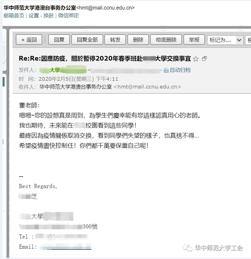 这批学生错过了上学期末的统一选课,所以董老师积极为同学们选课做后援,因为疫情,学校的课程也开到了网上,要衔接学院教学秘书、任课老师和教务处,邀请本科生院、研究生院的负责老师加入交换生qq群交流,并搜集每位同学遇到的恢复学籍、选课难题汇成表格交给相应部门的负责同事及时处理。在及时准确的解决同学恢复校内学习的问题后,同学们的情绪都稳定下来,各项校内学习也在平稳开展,急刹车软着陆就完成了。另外要做的就是尽一切可能让学生不留遗憾,除了那些实在无法在后续的学业中安排出交换时间的同学,董老师要为那些有意愿在下学期或者后续学业规划中愿意继续赴台交换的同学圆梦,不留遗憾,随后逐一统计同学们的后续安排,有的希望能在秋季学期赴台,有的希望能在2021年春季学期赴台,有的需要多一些时间来安排和决定。董老师非常理解这不是一个容易做的决定,也充分尊重学生的个人意愿,并鼓励他们能统筹考虑自己的学业,引导他们既不轻易放弃,也不因要赴台而引发无法正常毕业或其他重大损失,请他们耐心跟家人、导师、辅导员、专业老师做充分沟通,给他们足够时间做决定,而后逐一跟台湾姊妹校沟通因疫情暂停春季交换项目事宜及学生对后续交换的个人意愿。“隔离病毒不隔离爱”,是今年春晚主持人用的一句话,也是董老师在对台往来邮件中用的最多的一句话,她希望两岸高校在大疫当前能联起手来,共同呵护我们的同学,为他们的成长保驾护航。