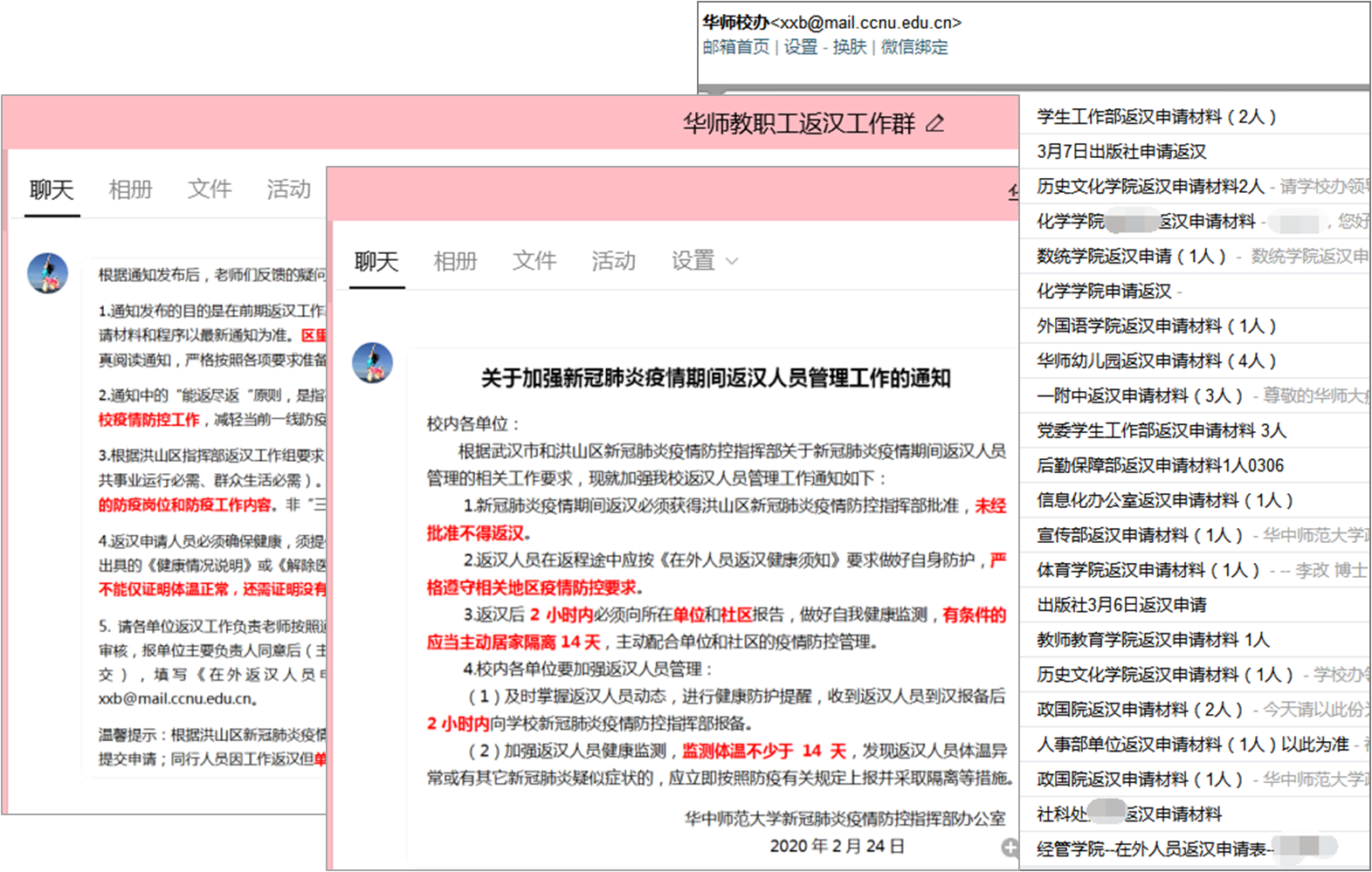 期间,她全面承担了学校教职工提前返汉服务工作,这是一项长期且复杂的工作任务,区里的返汉政策不断在变,老师的情况又各不相同。为确保学校返汉工作有序推进,她主动联络,快速掌握相关政策,及时传达和反馈。自2月10日启动返汉工作以来,她的手机变成了“热线电话”,通过电话、邮件、QQ、微信等咨询的人不计其数,面对老师们提出的问题、发泄的情绪,她积极沟通,耐心解答,悉心劝慰。为提高申请成功率,她认真审核,严格把关,反复沟通,全力争取。截至目前,共计收到返汉申请近200人次,报送14批( 60余人次),已为28人成功办理返汉手续。这还不是工作的全部,要确保返汉稳步开展,更要服务学校疫情防控大局。为确保返汉人员不造成疫情扩散,她对所有返汉人员进行全程动态跟踪,提醒做好返程安全防护,督促校内各单位做好返汉人员到汉报备和体温监测,确保教职工安全返汉。