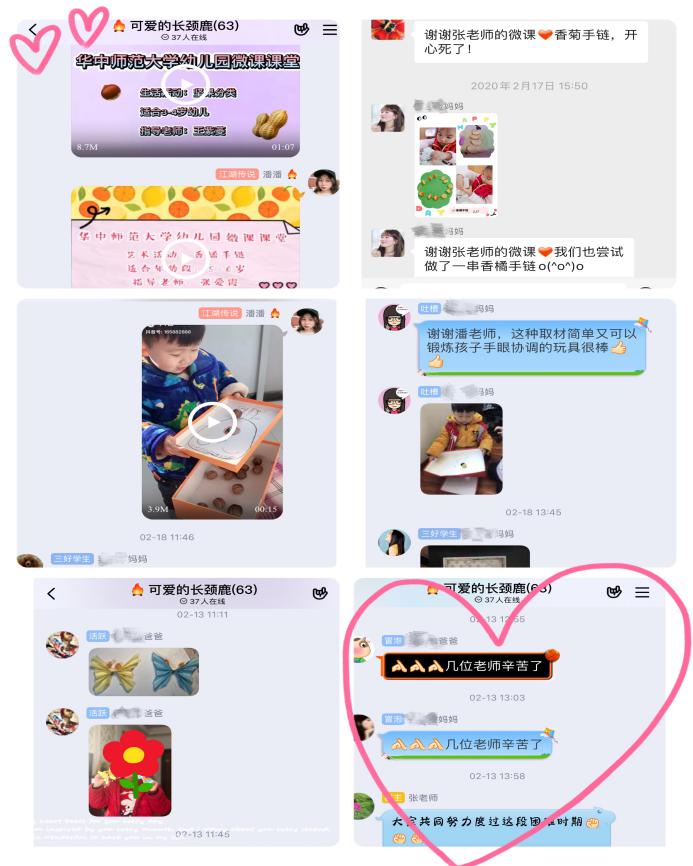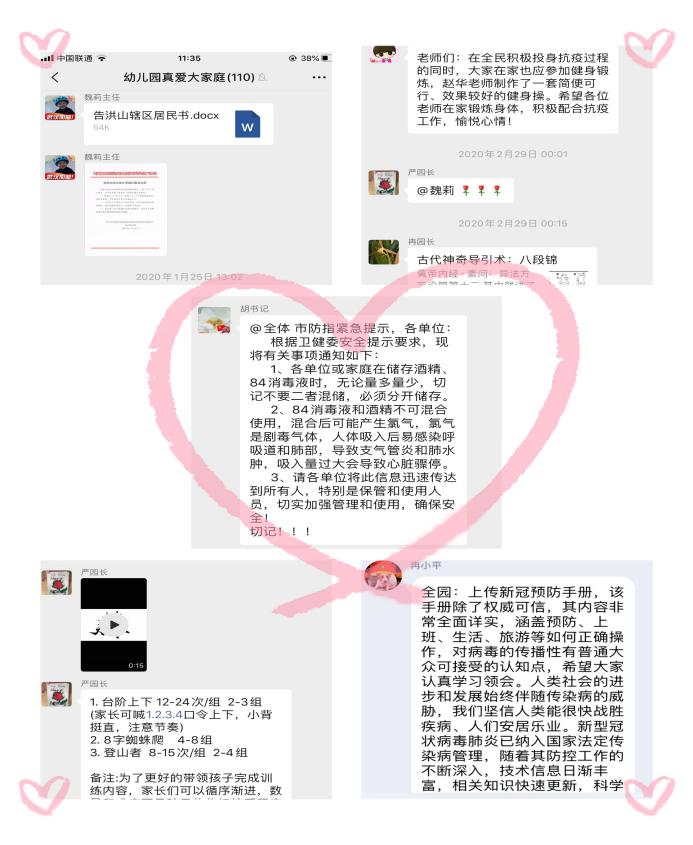 老师们虽宅在家,但为了在疫情期间帮孩子们进行心理疏导,帮助家长合理安排孩子的一日生活,她们在家精心录制视频,准备了一些“亲子陪伴指南”,包括:防疫知识、居家作息、亲子游戏、亲子运动、绘本故事等。通过QQ群、微信群等方式向家长推送,供家长和孩子在家自愿选择,让家长孩子们在家的日子更加丰富多彩。