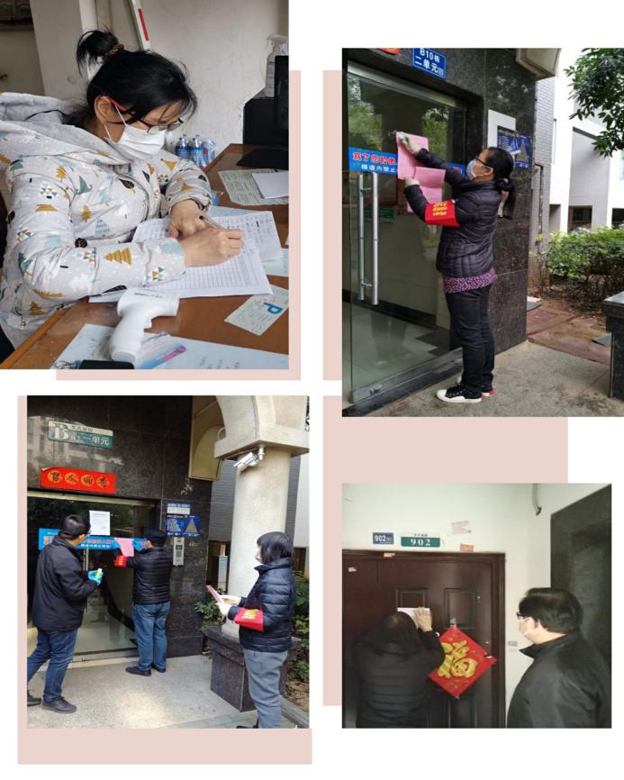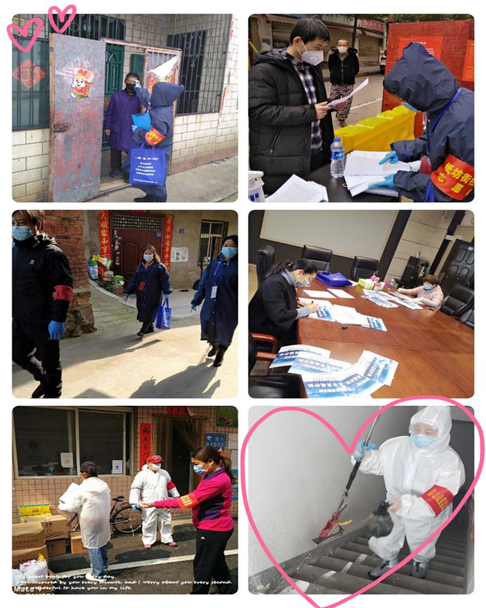 其他的老师们也纷纷行动起来,下沉到社区,争当志愿者。有的老师主动报名参加学校防疫应急队,为教职工送药,呵护大家的健康;有的老师配合社区排查“四类”人员、统计上报住户的体温、收集和制表统计;有的老师值守东门楼栋、巡逻,劝返在外游离的群众,配合政府、学校的号召与指令;有的老师协助居民购买生活物资,解决大家的生活所需;有的老师对于本楼栋的独居老人、空巢老人给予关怀和帮助,传递关爱和温暖;有的老师协助后勤部门做好社区卫生死角的清理和消毒工作,努力为小区居民筑造一道坚实的疫情防护墙;有的老师发放宣传材料、张贴宣传海报,将最新的疫情知识传递到每一位居民……