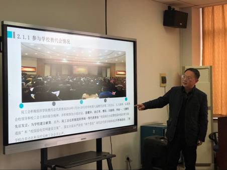 大会第四项,工会主席李闻一同志作工会工作总结报告。他分别就年初工会计划的完成情况、民主建设情况、活动组织情况、工会提案情况、青年教师成长助推情况、维权帮扶情况和年度取得成绩等作了总结发言。2019年较好地完成了年初工作计划,开展了踏青、羽毛球、兵乓球、教职工舞排表演、青年教师座谈会、荣退教师和新婚夫妇见面会等活动,积极组织提案提交反映教师诉求,办理了36位女工重大疾病保险并帮助了5位新入职教师加入大病医疗互助系统,慰问生病等11位教职工及其家人,参加校工会组织的“校园雨污分流”、“校园环境治理”等面对面咨询活动,获得了校工会的高度认可。他还鼓励老师们继续对教学、科研等各方面提出相应提案,为学校的发展建言献策。最后感谢全体教职工对院工会工作的大力支持和积极参与,院工会团队明年更努力,为大家服务更好。
