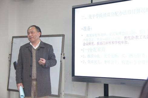 接着,院党委书记聂耀华同志作学院财务报告并解读相关办法修订说明。他报告了学院的财务收支情况并对经费收支结构进行了阐述。在相关办法修订说明方面,他就教职工教学奖励办法、科研成果奖励办法、绩效津贴标准、岗位津贴以及突出贡献奖励办法的调整情况做出了详细说明。