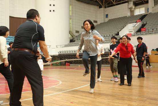 (通讯员:张帆 谭智仁)11月7日上午,华中师范大学2019年运动会教工组跳绳比赛在佑铭体育馆内举行。本次比赛要求教工们在两分钟内进行穿梭跳绳,总计跳绳个数最多的队伍获胜。我院陈淑云、王佑辉、何德平、吴琼、谢志鹏、白云、舒鑫才、周雨菡八位老师参加了本次比赛,院党委书记聂耀华带领部分师生前去加油助威。