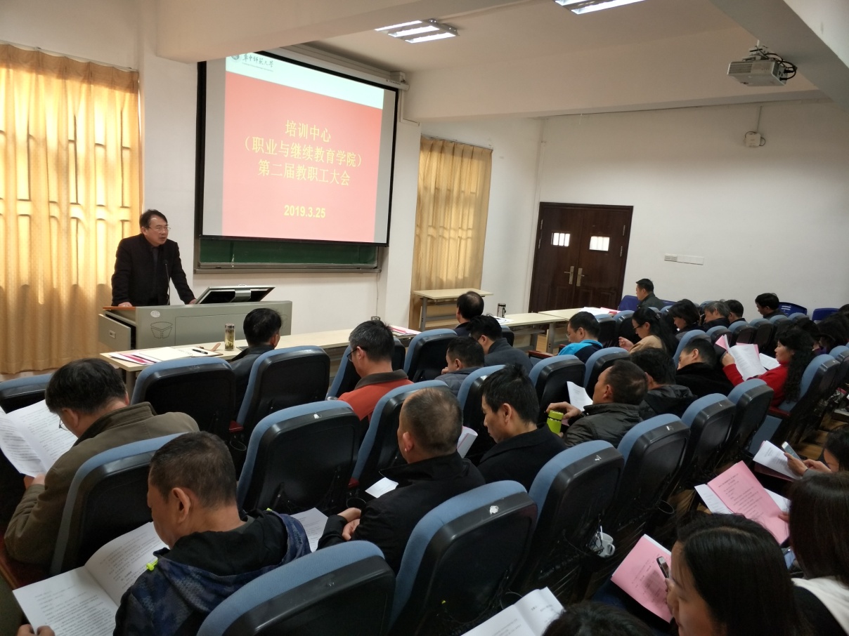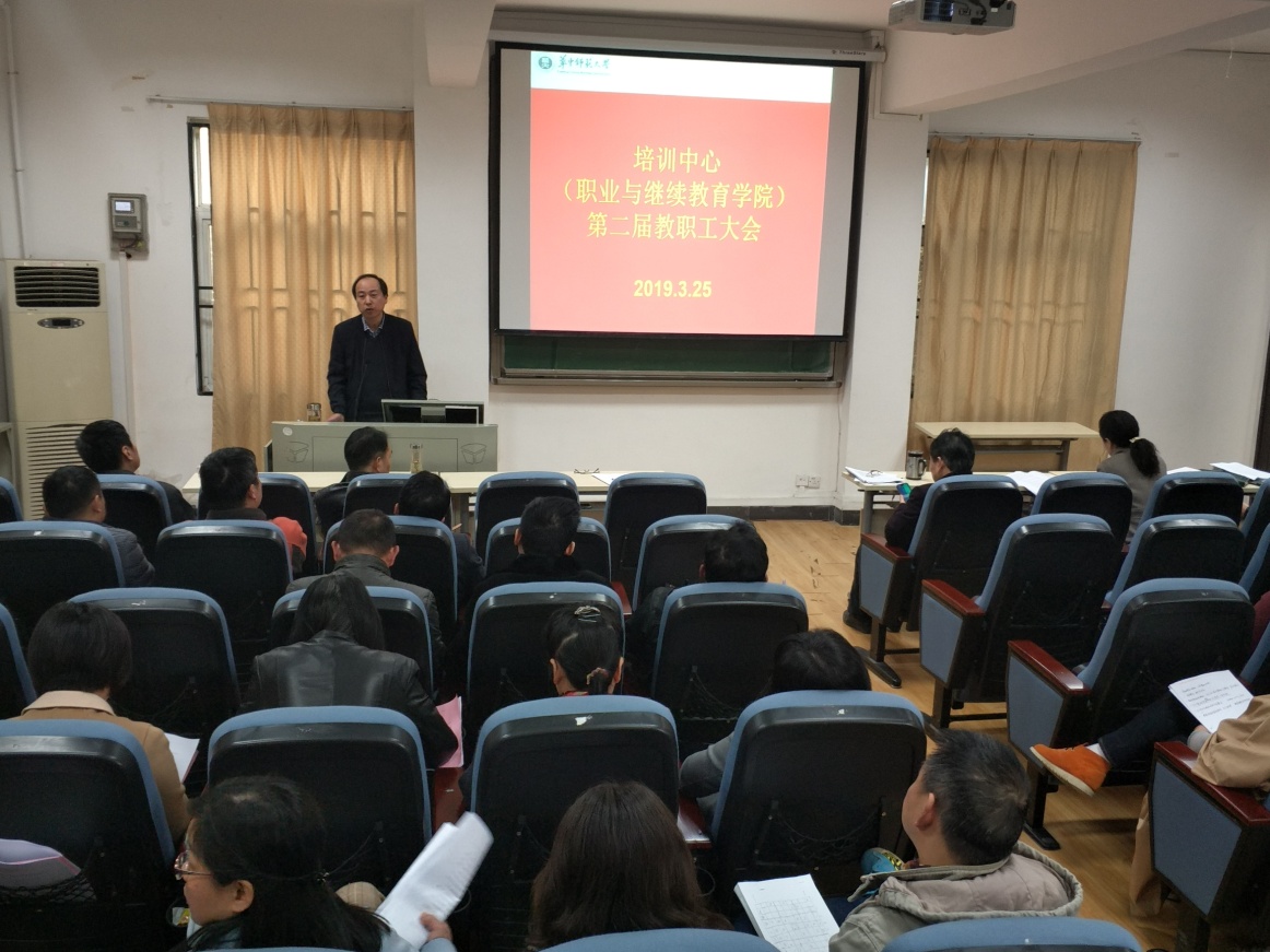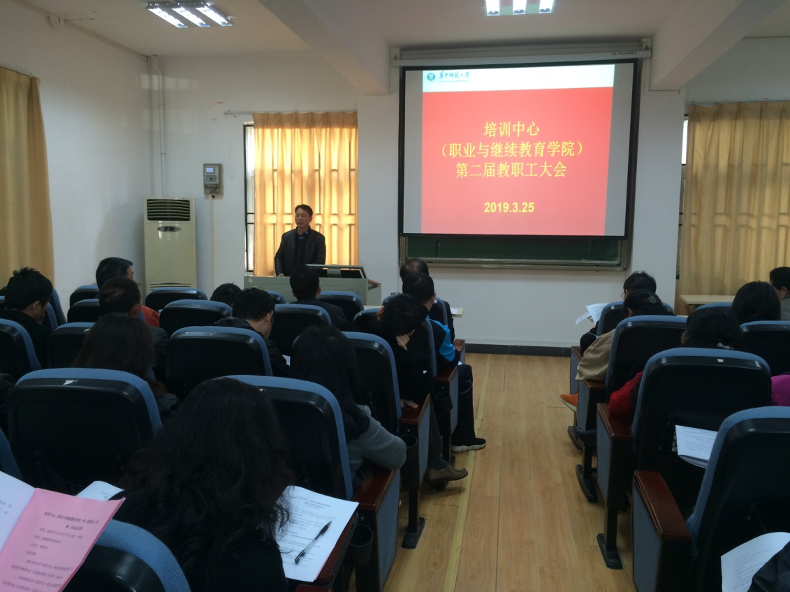 2019年 3月25日下午,培训中心(职业与继续教育学院)第二届教职工大会第一次会议在南湖教学楼104顺利召开,全体教职工参加了会议。