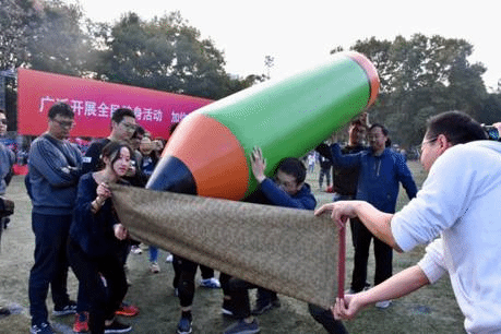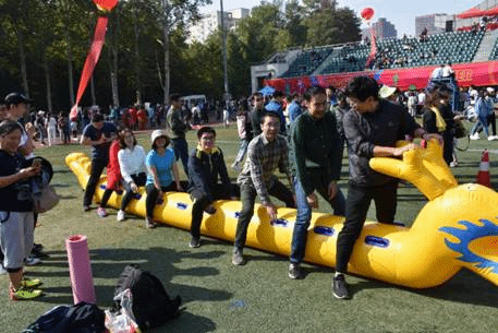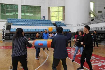 在雷霆战鼓趣味项目中,洪建国、汤学兵、王琰等教师通过控制弹簧床进行击球,依靠协调合作调整站立位置来维持皮球不落地。虽然是一场趣味活动,老师们同样十分重视,未比赛时便已经在进行积极的练习。尽管中途出现失误,但他们仍保持积极心态迅速将皮球捡起,最终取得击球165个的好成绩。赛后不论结果,每一位老师脸上都流露着比赛带来的轻松与愉悦。