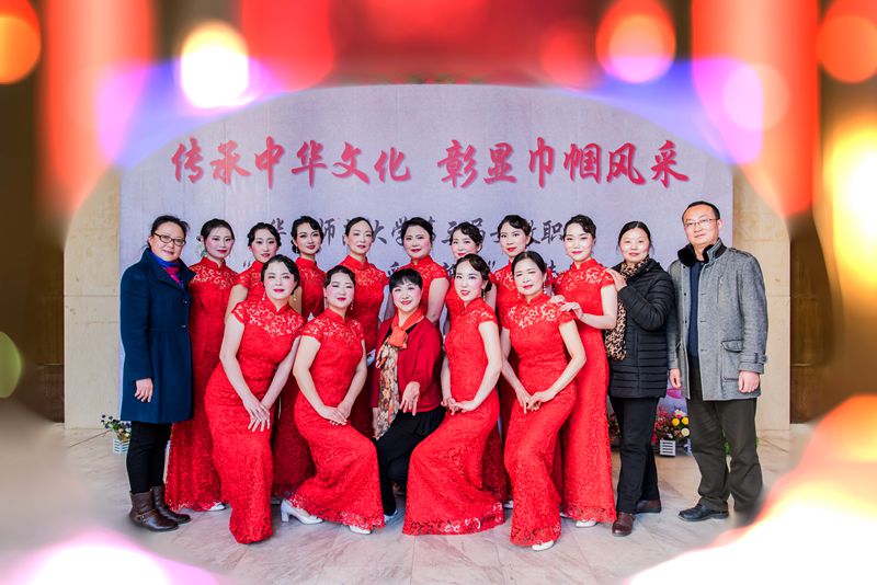 伴随着悠扬灵动的乐声,心理学院女教师们着一袭婀娜旗袍,曼妙多姿,笑靥如花般踱着步子,缓缓走向舞台。旗袍丝缎材质的柔软触感,将典雅与华丽巧妙结合,艳之韵之,柔美雅典。正如心理学院庄重娴雅的女教师们,热情而不失矜持,坚韧而不失温柔。兢兢业业的投身于教学岗位,以优雅拨刚强,柔而不软,坚韧沉静。老师们身着绯红及踝旗袍,踏着细碎的步子,衣袂飘飘,优雅内敛,清艳如一阕花间词,皎皎兮似轻云之蔽月,飘飘兮若回风之流雪。旗袍宛如一味药引,将老师们的沉静与蕙质娓娓道出;而老师们的优雅温婉,将旗袍的唯美与韵味发挥到极致。