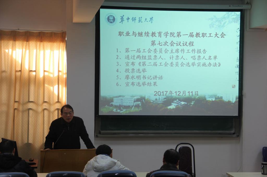 职业与继续教育学院于12月11日上午在南湖104报告厅召开第一届教职工大会第七次会议,会议主要议题是听取第一届工会委员会主席工作报告,选举学院第二届工会委员会及推选学院参加学校教代会代表。会议圆满完成各项议程。
