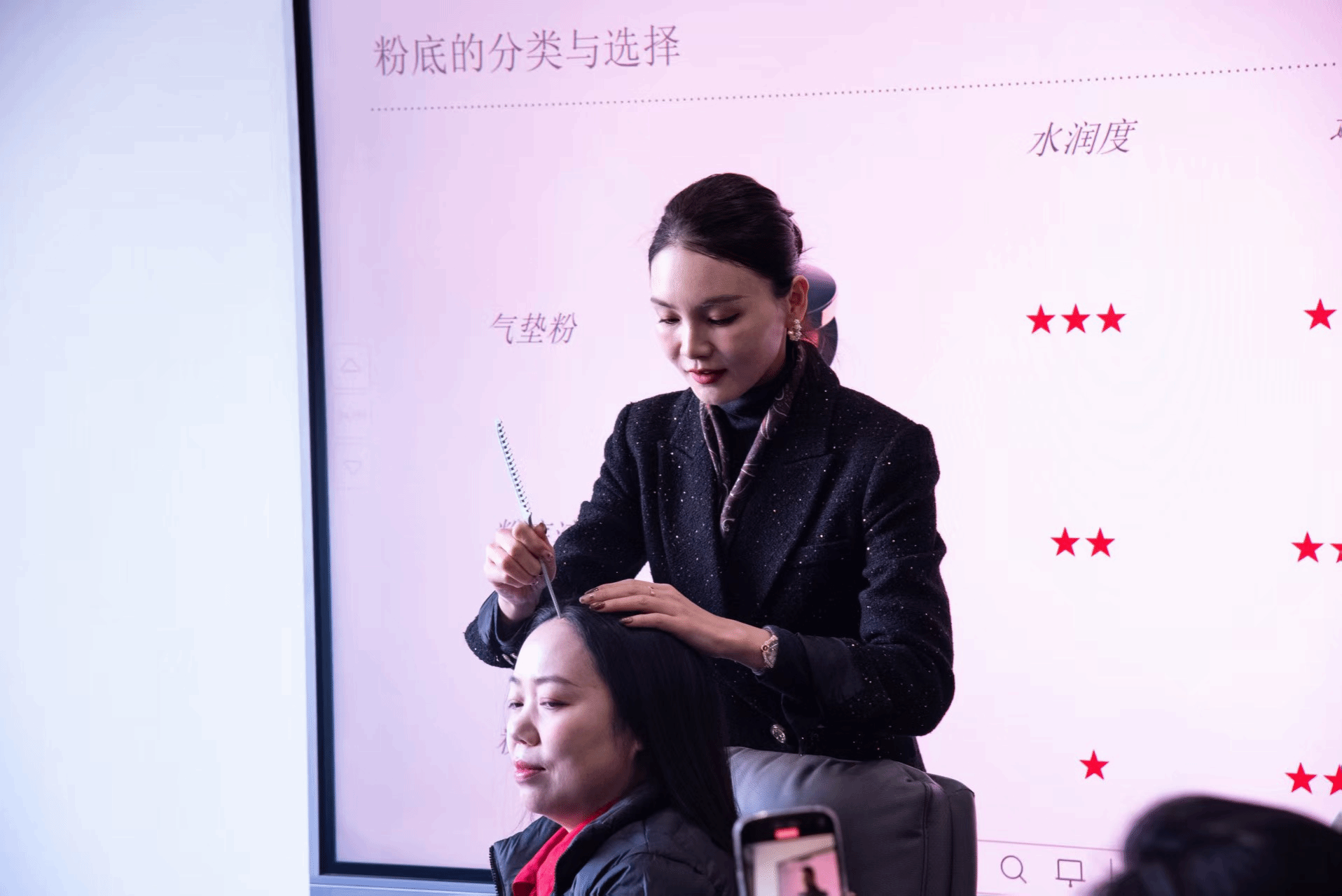 在互动实践环节,现场氛围热烈而活跃。女教职工们纷纷拿出自备的化妆品,在讲师的指导下分组练习。讲师逐一巡视指导,针对每位教职工的面部特征给出个性化建议:“眼距较宽的老师可以适当加重内眼角眼影,让五官更紧凑”“肤色偏黄的老师适合选择暖调口红,更显气色”…… 大家认真聆听、积极提问,互相交流化妆心得,现场不时响起阵阵讨论声与欢笑声。不少老师表示,平时忙于教学工作,很少系统学习化妆技巧,这次培训解决了自己多年的 “化妆困惑”,尤其学到的通勤快速妆发方法,非常适合日常工作使用。在发型方面,子灵老师也展示了适合职业场合的发型,如侧分丸子头盘发,并讲解了丝巾搭配的技巧。