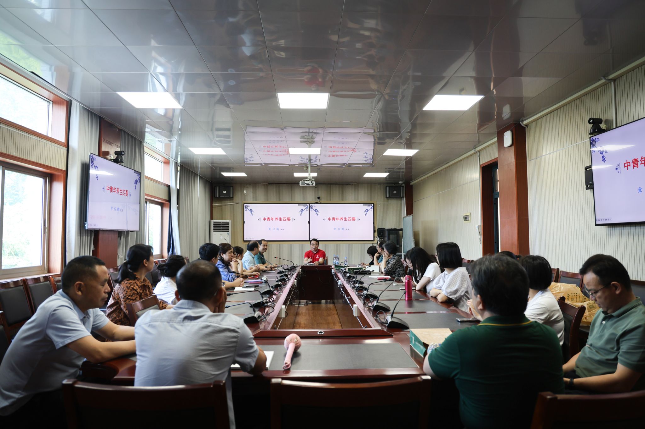 活动第一环节由章程鹏做专题讲座,针对中青年教师群体的工作和生活等方面,传授相关的中医养生和保健知识。章教授的讲座围绕中青年期养生的“四要”,即“要认命、要放下、要护短、要坚持”,援引《黄帝内经》、《养生论》等中医经典,总结了中青年阶段的养生要点和特点,为老师们提供了有价值的健康指南。章教授讲解的第一要点是“认命”,帮助老师们认识生命和身体发展的规律,了解在中青年阶段需要重点预防的疾病;第二要点是“放下”:养生即养神,要懂得静心养神;第三要点是“护短”,了解自身体质,有针对性地调理身体,修复身体的短板;第四要点是“坚持”,顺应自然节律,将养生作为一种生活方式,持之以恒,收获健康的人生。