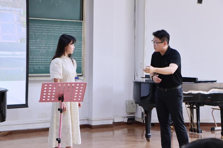 叶楠辛以古诗词艺术歌曲《春花秋月何时了》为范本,通过逐句解析演唱技巧与情感表达,引导学生体会“以声传情、以情入画”的古典意蕴。