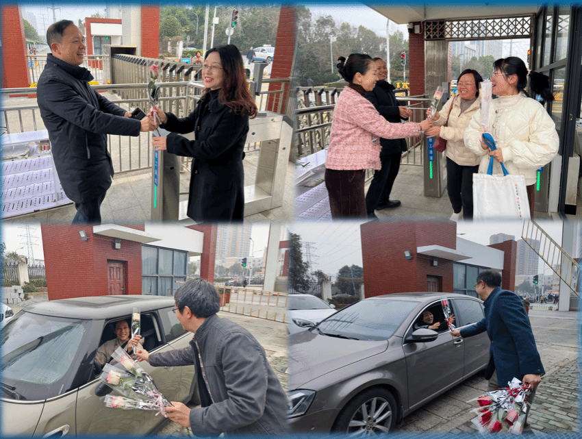 3月8日清晨7点,晨曦刚刚洒向大地,宁静的校园正慢慢苏醒。学校当天的值班干部和工会负责同志早已等候在学校北门,大家手持鲜花热情地为每一位周末到岗女教工送上节日的慰问与祝福。