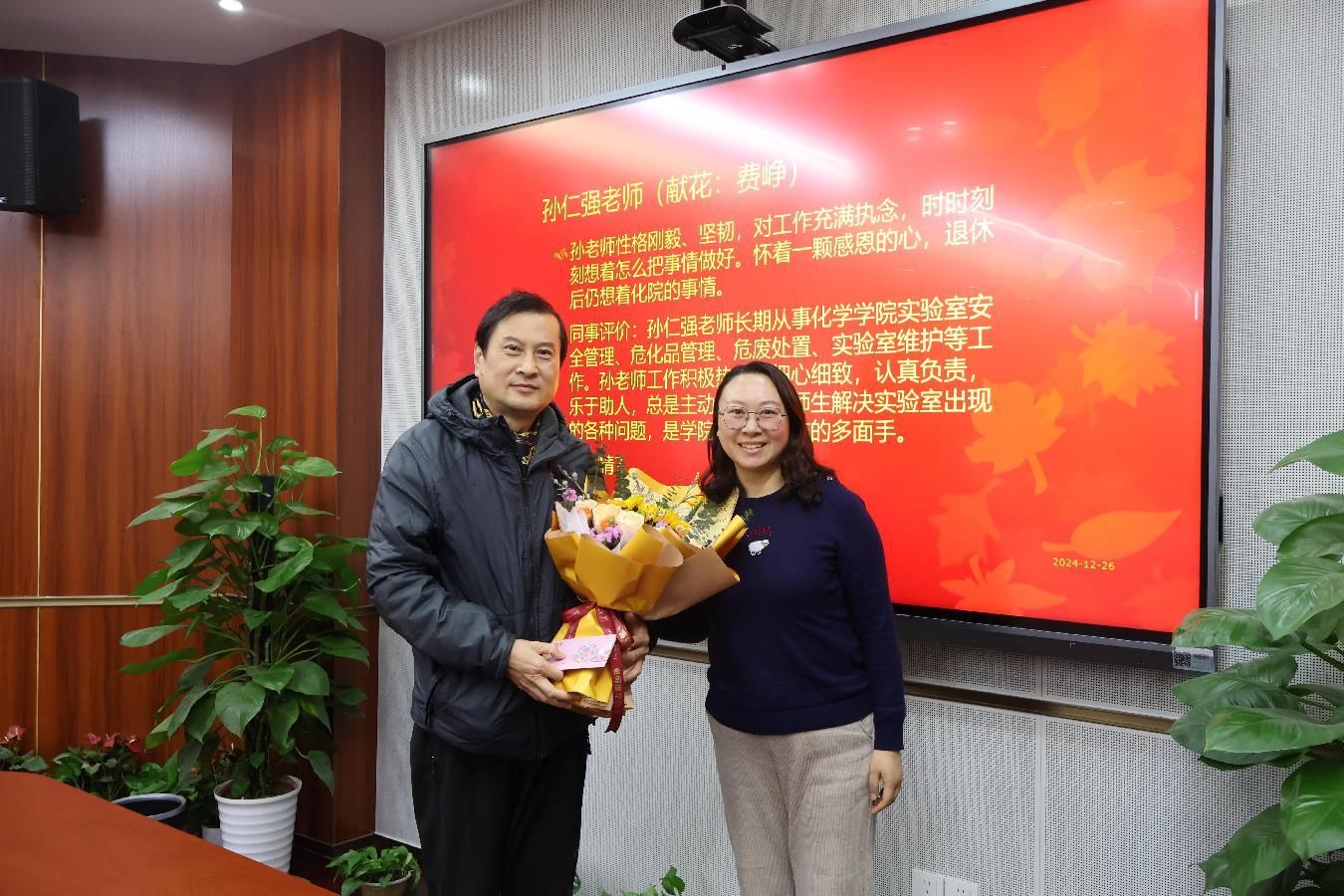 邱明强介绍了2023-2025年荣休教师吴宏、李永健、李武客、 刘小鹏、孙仁强、熊焰、王成钢、张文华、周红斌、徐星满的主要事迹。在职教职工代表为荣休教师献花,表达了对前辈们的感激与不舍,高度赞扬了荣休教师们在教育事业上的卓越贡献和崇高师德,几十年来坚守岗位、默默耕耘,用实际行动诠释了“学高为师,身正为范”的教育家精神,为学院发展奠定了坚实的基础。