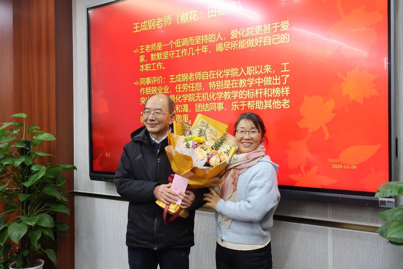 岁月映初心,教坛传薪火。12月26日,化学学院第三届荣休教职工茶话会在逸夫化学楼H502顺利举行。化学学院党委书记邱宝国,党委副书记陈德均、朱峰,工会主席艾智慧,荣休教师,在职教职工代表参加会议。会议由学院工会邱明强副主席主持。