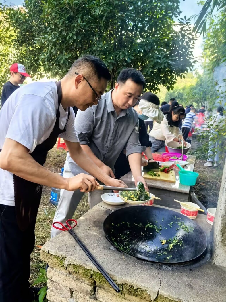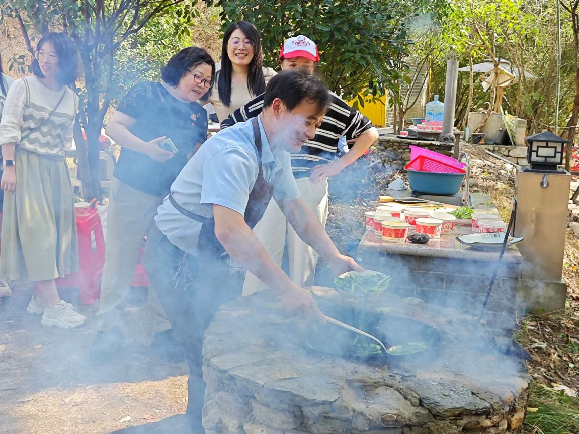 参观完毕,大家步行至武汉湿地第一谷——姚家山溪谷景区,在景区内的柴火灶台自己动手、大展厨艺。十人一组,有的择菜,有的洗菜,有的烧火,有的掌勺,看着合作烧制的食物逐渐变得令人垂涎欲滴,内心充满了成就感。大家围坐在一起,一边品尝着自己的劳动成果,一边畅谈欢笑,现场一片温馨祥和。
