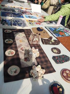 最后,武汉市文旅局的专家们向我们展示了非遗文化的魅力——手工制品的制作与传承。专家们详细介绍了指舞线(一种手缝拼布的编制方式,可以制作出拼布、禅绕画、手工刺绣、布艺玩偶等传统手工制品),以及楚香的由来与制作方式。老师们纷纷对台面展示的各色手工制品仔细品评,爱不释手,相互传看。