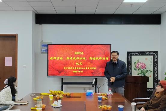 院党委书记张勇进行了最后的总结发言。他对荣休教师过去的辛勤工作表示感谢,感谢他们为学院教学工作做出的卓越贡献,祝愿荣休老师们在未来拥有更加精彩的生活。张书记同时还对新进老师们给予深厚的期望,希望他们能以荣休教师们为榜样,在未来的工作中继续奋进。最后,张书记给各位新婚老师送上真挚的祝福,希望各位教师能继续努力,“经”次一聚,奋进未来。