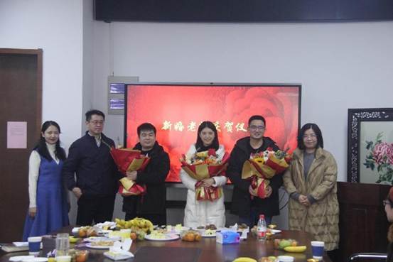 仪式最后,庆贺朱俊鹏老师、童庆蒙老师和樊启迪老师新婚。几位新婚老师与大家分享了自己的喜悦,与会老师们也纷纷为他们送上祝福。现场笑声不断,气氛活跃。我院党委副书记陈娟、潘胜文老师、肖红蓉老师为新婚老师送上鲜花。