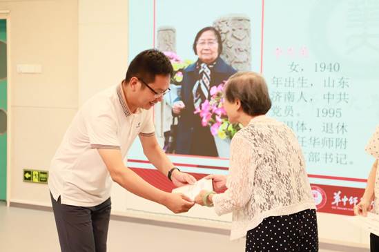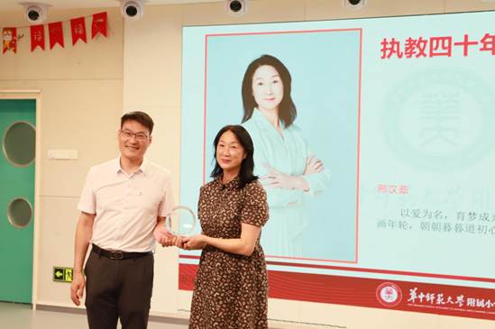 然后,由宋校长为华师附小邢汉茹主任颁发光荣执教四十年纪念奖杯。