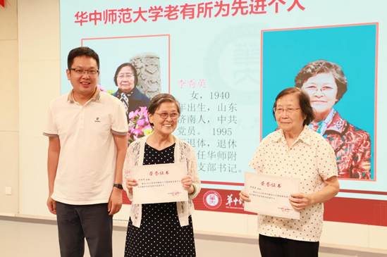 会议第六项,为受表彰的老师们颁发荣誉证书。首先,罗处长为李秀英和蔡根娣两位退休老教师颁发华中师范大学老有所为先进个人奖项,并送上节日的祝福。