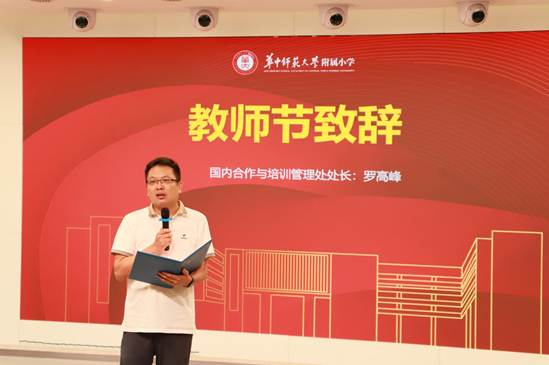 大会第四项,华中师范大学国内合作与培训管理处处长罗高峰致辞。罗处长向辛勤付出的附小教师们送上衷心的感谢和诚挚的祝福。