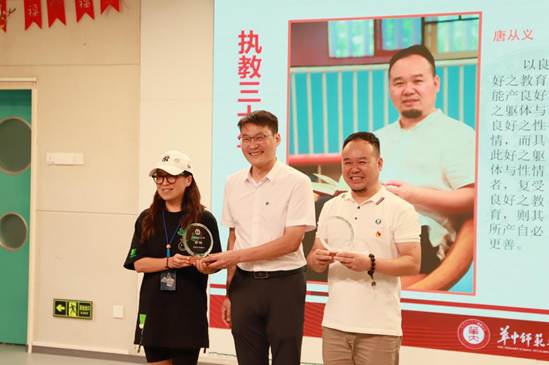 接着,宋校长为华师附小党总支委员、工会主席唐从义和彭皓老师颁发光荣执教三十年的纪念奖杯奖杯。