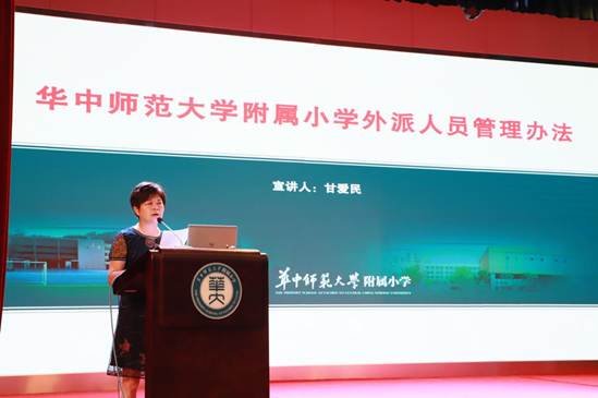 最后,附小党总支委员、副校长甘爱民宣读了华中师范大学附属小学外派人员管理办法,向与会代表介绍了华师附小外派人员的相关选举事项以及对外派人员的相关管理情况。
