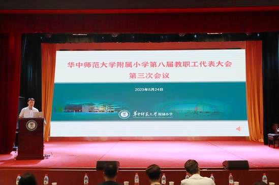 2023年8月25日,华中师范大学附属小学第八届教职工代表大会第三次会议在我校南湖校区顺利召开。全体校领导、学校教职工正式代表和列席代表参加会议。会议由附小党总支委员、办公室主任刘峥主持本次。