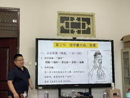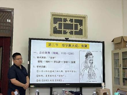 参赛选手洪国强老师主讲《中国古代文化史》第五讲“儒学复兴:程朱理学”,开篇设计与学生互动小环节,由《太极图》的宇宙论导引出试讲内容,生动活泼。