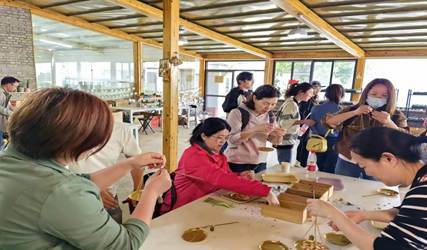 在中药香囊体验活动中,工坊的工作台上摆满了各种香料与中草药,老师们认真地将中草药放到石磨中,不断磨碎,最后得到了一堆细腻、芳香的中药粉。将磨好的中草药装入香囊中,细心地搓揉、捏合,将不同种类的中药混合在一起。香囊的芳香气味弥漫开来,散发着自然的清香。这场中药香囊活动,让大家感受到了传统手工制作的乐趣和美妙,也让大家更深刻地了解了中草药的功效和使用方法,体验到了自然的魅力和美好。