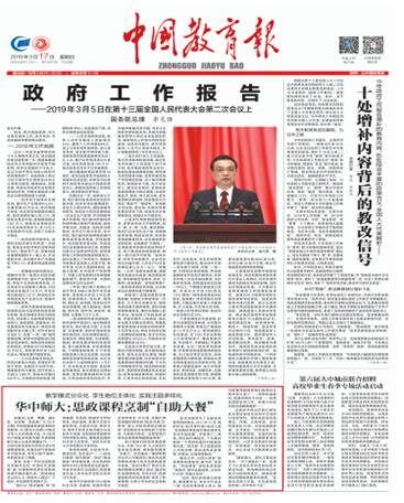 (2019年3月17日 中国教育报头版刊登学校思政课分众化教学改革)