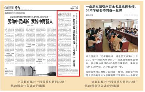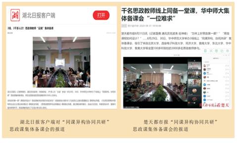 (2020年 新华社客户端、人民网、光明网、学习强国、党建网、中国教育报、中国教育新闻网、中国社会科学网、湖北日报、楚天都市报等二十余家主流媒体已对“同课异构 协同共研”思政课集体备课会进行报道)