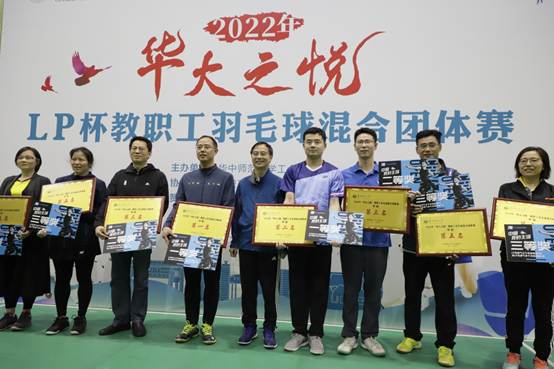 下午6点半,比赛在颁奖典礼中进入尾声,在两天的持续比赛中,各位教职工不仅展现个人的球技,更注重相互间的配合,强有力的挥拍,灵活转体,高技巧的搏杀,羽毛球运动的魅力感染全场。 此次比赛的成功举办,不仅展现了教职工团结、拼搏、进取的精神,增进了大家对体育锻炼的兴趣,更重要的是在比赛中加强了各个学院羽毛球运动爱好者之间的交流与沟通,增进了大家的友谊,营造了良好的校园文化氛围。至此,华中师范大学2022年“华大之悦”LP杯教职工羽毛球混合团体赛完美落幕。