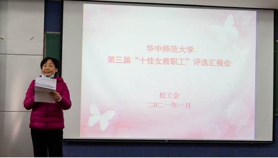 为全面贯彻华中师范大学第十二次党代会的会议精神,引导和激励广大女教职工在学校的改革和发展中建功立业,积极投身于教师教育领先的世界一流大学建设,2021年1月8日下午,校工会在9号楼4楼报告厅举办了华中师范大学第三届“十佳女教职工”评选汇报会。校党委副书记查道林出席此次评选会并致辞,相关学院书记和主席作为评委共同参与,评选会由校工会常务副主席郭春娥主持。