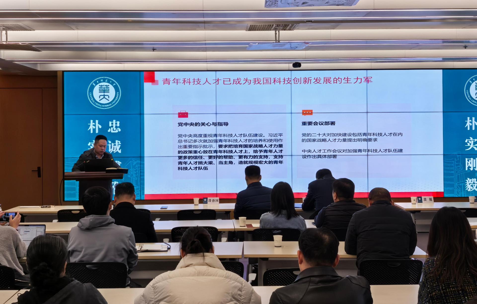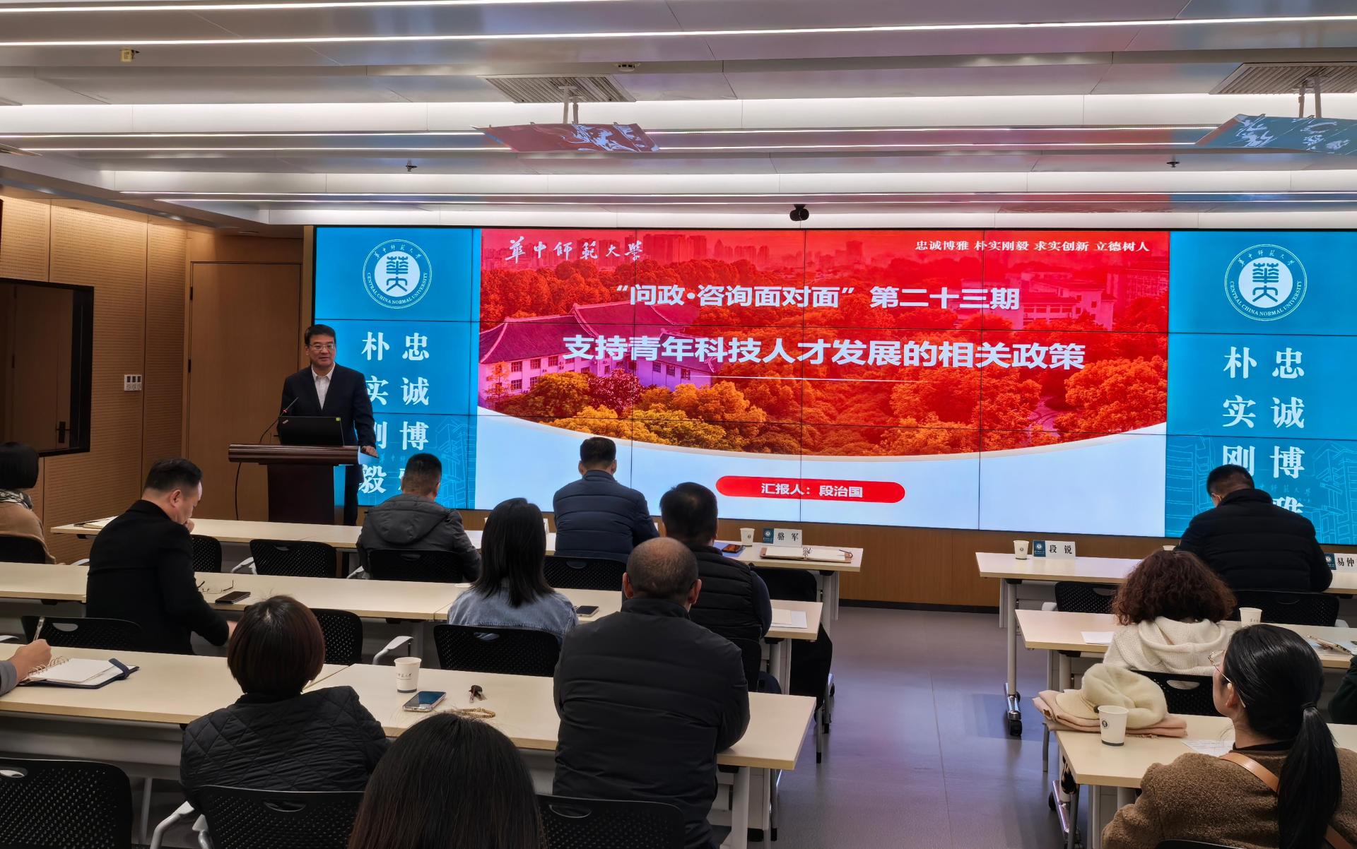 社科处段锐处长首先以如何推进有组织科研为主题,从自主知识体系构建和咨政服务能力提升两个大的方面,向大家介绍了社科处如何在学术资源、学术阵地、优秀种子培育和智库服务上推进哲学社会科学高质量发展,并为大家展示了部分科研项目申报信息。科技处段治国副处长以支持青年科技人才发展的相关政策为主题,向大家介绍了青年科技人才在科技创新发展中的作用、加强青年科技人才培养和使用的若干措施以及措施的落实落地。