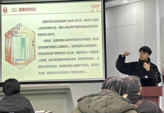 最后,郑紫晨同学就财产继承展开宣讲,他以遗赠抚养协议与遗嘱继承效力冲突的现实案例为切入点,激起听众的好奇心;随后从继承的概念和原则、继承分类等方面展开了详细的讲解。首先,在介绍继承的概念中,他强调财产继承并非强制的,且债务同样在继承的范围内。然后,郑紫晨同学详细介绍“权利义务相一致原则”,他指出,继承人的继承权应当与其承担的义务相匹配,比如尽了主要义务的继承人可以多分遗产。最后,他就法定继承、遗嘱继承、遗嘱抚养协议这三种继承的方式展开了介绍。在整个宣讲过程中,他通过生动的案例和实用的建议,帮助大家更好地了解财产继承的相关法律知识。具体解决了处理不同继承方式效力冲突、确定继承开始的时间、各种遗嘱形式的书写要求等问题。