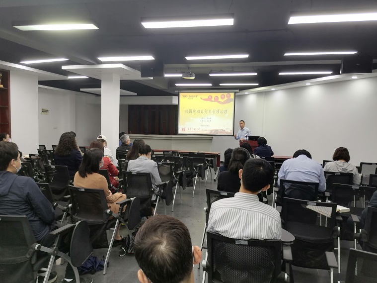 随后,保卫处处长王东爽介绍电动车专项治理工作。王东爽提到,目前学校有9000多辆电动车,其中7000多辆车是学生的,但是7000多辆车有一半没有合法手续,电动车的质量良莠不齐,存在着停车乱、行车难、充电难等问题,这给学校保卫处治理带来难度。